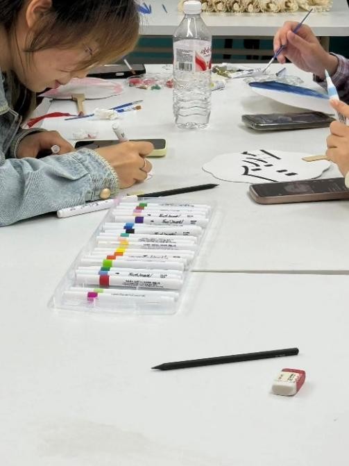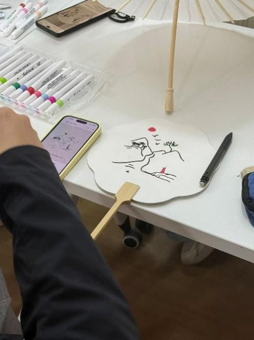 活动现场暖意融融。素净的伞面与扇面静静铺开,丙烯马克笔、水彩颜料等工具一应俱全,还有叶片、花瓣等小物件可供取用,为创作搭建起温柔的舞台。无需专业技法,大家随心落笔:有人细描柳丝拂水的轻柔,有人勾勒桃李争妍的热烈,将心事藏于色彩之中,把烦恼随春风消散。
