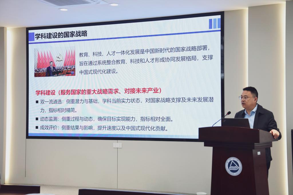 会上,付少海围绕学科建设发展作专题报告。他指出,学科发展要立足国家战略,主动对接未来产业,紧扣学校建设思路,精准把握主要观测点,分层分类制定科学合理的发展目标。迈向特色鲜明、优势凸显、国内领先、具有较强国际影响力的一流学院应该成为大家共同的追求。