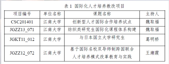 研究生培养更注重与国际化人才培养模式相接轨,与世界纺织专业著名高校、研究机构和公司,如North Carolina State University、UC Davis、Georgia Institute of Technology、德国卡尔迈耶集团公司、英国染色家协会等开展产学研合作和研究生联合培养;通过国家公派留学项目,王清清等20余名博士完成赴国际名校联合培养,张燕婷和孔震等同学赴德国卡尔迈耶集团公司参与国际先进企业技术的引进和消化,增强了研究生的科研视野和研究水平。在国际化研究生人才培养方面,主持了4项教改项目(表1),利用举办第五届国际纺织生物技术、第一届生态纺织可持续发展、12届亚洲纺织会议(分会场)、先进功能纺织材料国际研讨会和纺织生物技术研讨会等国际学术会议,扩大了参与国际合作的纺织领域专家的范围。联合了美国、英国、比利时、德国等11所世界著名纺织院校的学者编写出版了专著《Surface Modification of Textiles》(魏取福教授任主编),英国著名的纺织出版社Woodhead出版,自2009年7月出版以来已被90多家国内外图书馆收藏使用,并被英国Heriot-Watt大学等高校推荐为研究生辅助教材。以该著作为教材的江南大学研究生课程《纺织材料的表面改性》,被评为江苏省研究生双语授课教学试点课程。通过教育部外国专家“学校特色项目”,聘请在纺织专业领域具有国际公认的较高造诣的外籍知名专家12人来学校任教、合作科研和联合指导研究生。
