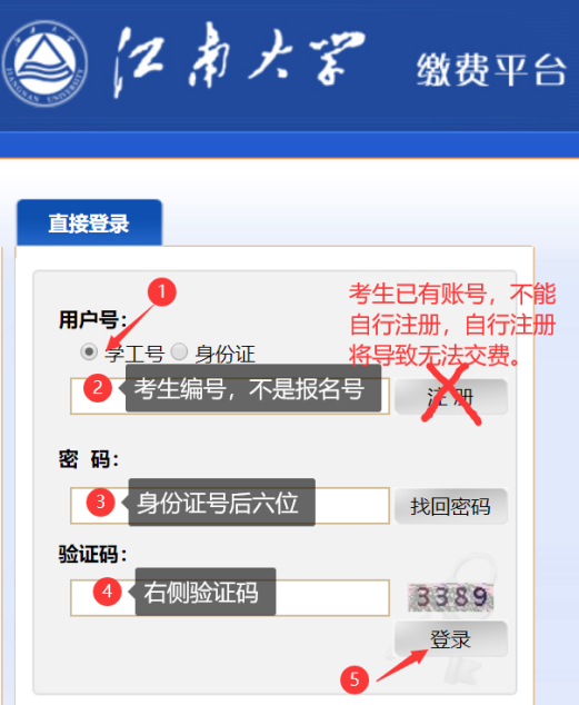 缴费说明:进入复试考生在学院规定的时间内登录“江南大学缴费平台”交纳复试费用,复试收费标准:80元/生。缴费网址://pay.atmyl.net/payment/。登录账号为准考证上的考生编号,登录密码为身份证后六位(友情提醒:考生账号已开通,切勿自行注册)。按照提示交费(使用网银),并打印或截图保存付费凭证。